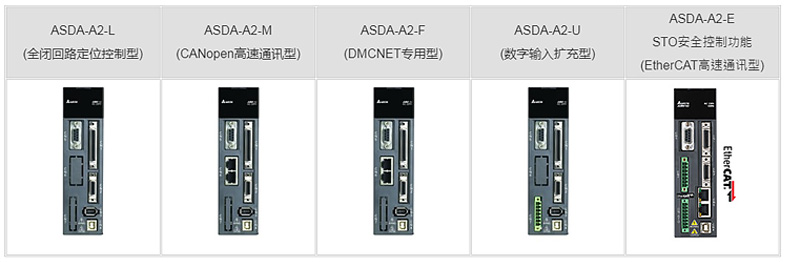 ASDA-A2系列共有五個機種:ASDA-A2-L, ASDA-A2-M, ASDA-A2-F, ASDA-A2-U, ASDA-A2-E