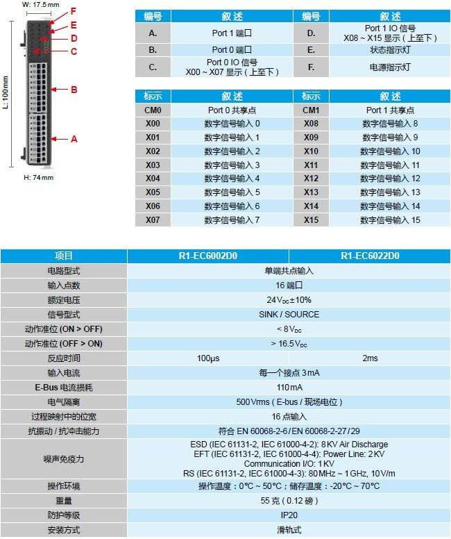 EtherCAT 16 通道數字輸入擴展模塊 - R1-EC60XXD0